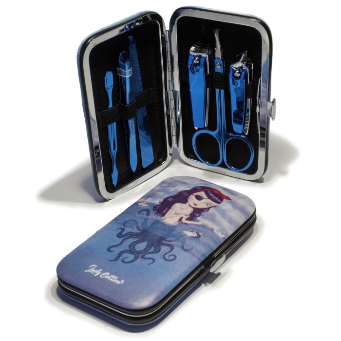 Un set per manicure completo, pratico ed elegante. Il design del cofanetto piatto presenta un'esclusiva illustrazione di Lady Cotton: una moderna sirena con tentacoli di polpo, ideale per chi cerca un tocco audace e originale alla propria routine di bellezza.