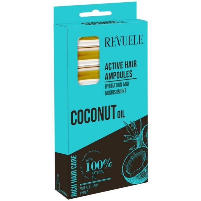 Le ampolle attive di Revuele con olio di cocco offrono una cura profonda per tutti i tipi di capelli.