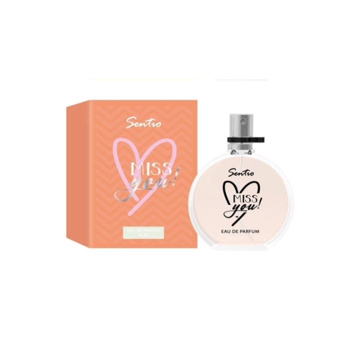 Miss You! Eau de Parfum di SENTIO è un mini profumo originale, racchiuso in un elegante flacone di vetro e presentato in una scatolina di cartone arancione decorata con un cuore.