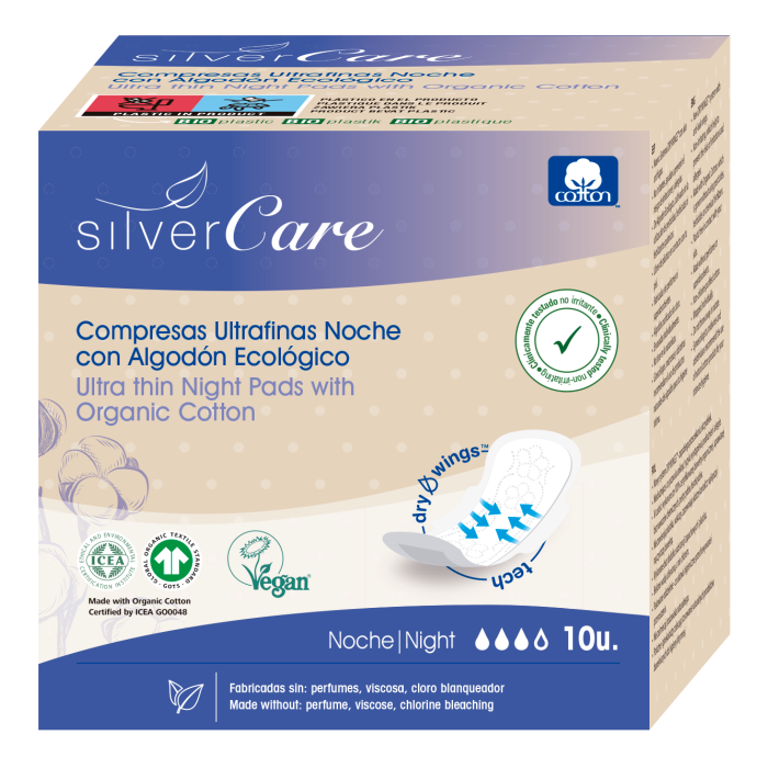 I Silver Silver Care Eco-Shoulders con Alas sono ultrasottili per una maggiore discrezione, con alette protettive e confezionate singolarmente.Contiene una lamina impermeabile e una busta singola biodegradabile. Privi di profumo e super assorbenti, privi di plastica a contatto con la pelle.