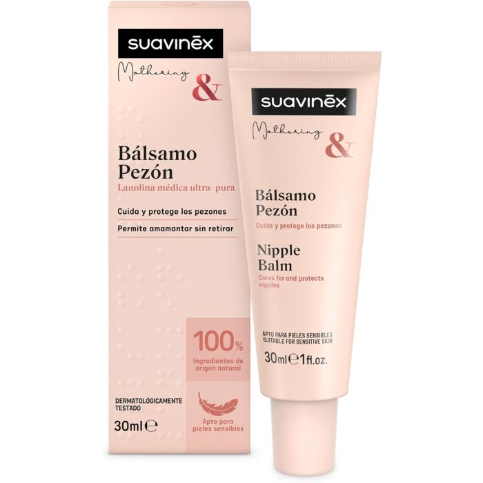 Il balsamo per capezzoli Suavinex idrata intensamente la pelle del capezzolo e aiuta a mantenerla protetta, consentendo di godere dell'allattamento al seno con maggiore tranquillità. Grazie alla sua base di lanolina medica pura, forma uno strato protettivo che aiuta a prevenire la comparsa di screpolature e fornisce comfort ai capezzoli durante l'allattamento. Inoltre, il potere idratante della lanolina la rende adatta a lenire le labbra screpolate e le zone di pelle secca. La sua formula priva di conservanti e profumi garantisce una cura delicata e sicura.