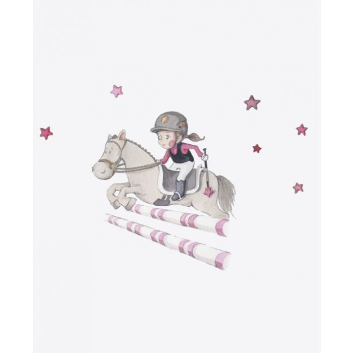 Gioiosa riproduzione di disegno ad acquerello dipinta a mano di bambina amazzone che salta con il suo cavallo circondato da stelle rosa. Riproduzione di disegni dipinti a mano in vinile 100 μm autoadesivo di alta qualità e facile posa, stampati in inchiostri lattice non tossici ad alta resistenza, con finitura opaca.