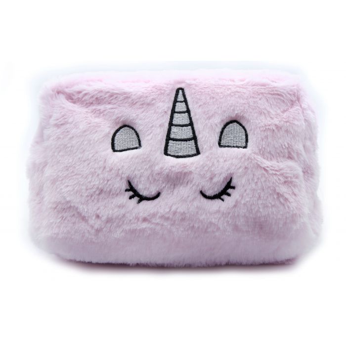 Beauty-case flessibile in capelli sintetici con un divertente disegno di unicorno.
