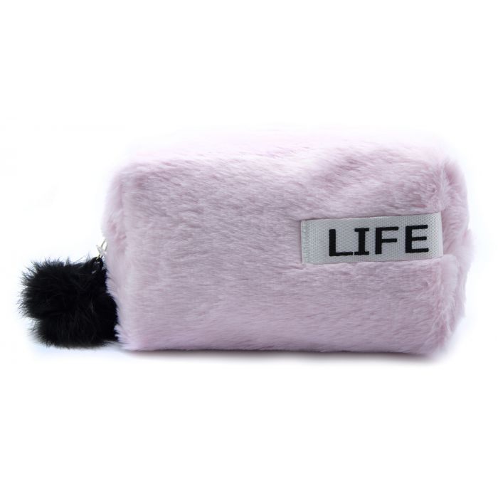Comodo beauty case con cerniera in alto e tiretto con cerniera a forma di pompon.  Dimensioni comode da portare in borsa.