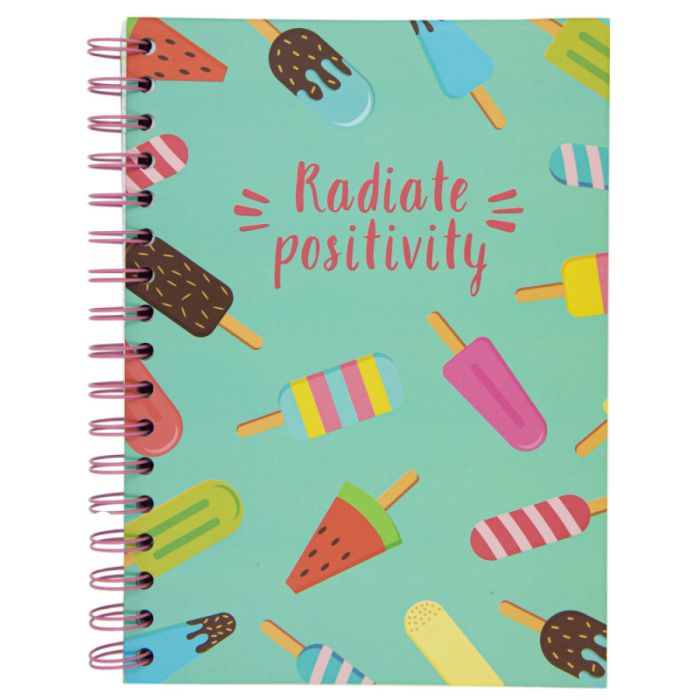 Taccuino A5 con coperchio rigido e rilegatura a spirale, con foglio interno bianco liscio.80 fogli. Ci sono due diversi design tra cui scegliere: panda e gelati.
