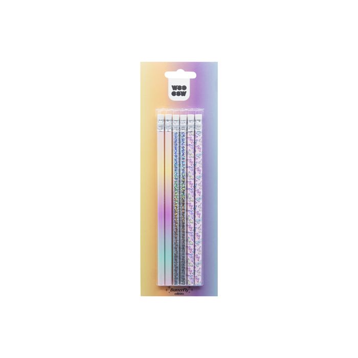 Pack di 6 matite rotonde in legno con gomma e dettagli in metallo. Due con stampa di farfalle, due in colori sfumati e due olografiche. Senza punta.