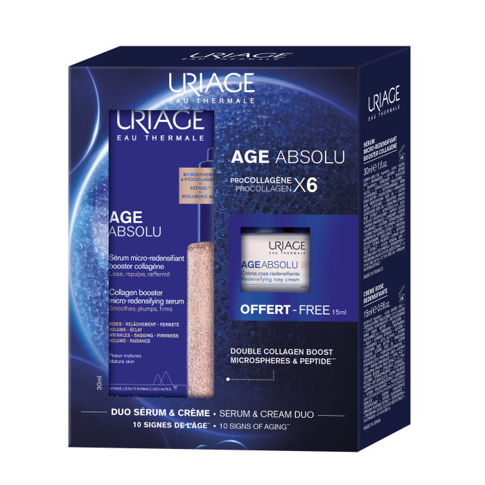 - Age Absolu Serum: questo siero ridensifica la pelle con un doppio apporto di collagene* e aiuta la pelle ad aumentare il suo livello di collagene grazie a un apporto X6 di pro-collagene. Fornisce alla pelle un effetto rimpolpante immediato. Agisce sui 10 segni dell'invecchiamento (rughe, cedimenti, perdita di compattezza, volume, densità ed elasticità, mancanza di luminosità, macchie scure) per una pelle più densa, rimpolpata e luminosa. * Test in vitro degli ingredienti