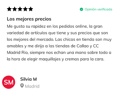 Entre las opiniones y reseñas que nuestros clientes comparten sobre nosotros destacan: multitud de descuentos y promociones exclusivas en perfumes, cosmética, maquillaje y mucho más durante todo el año, gran rapidez de envío y entrega, además de encontrar todos sus productos favoritos al mejor precio disponible. ¡Cuéntanos también tu experiencia!