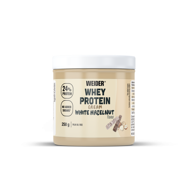 WEIDER presenta la Crema di Proteine Whey Cream White Hazelnut, una deliziosa crema proteica spalmabile a base di cioccolato bianco, vere nocciole e proteine whey di alta qualità.