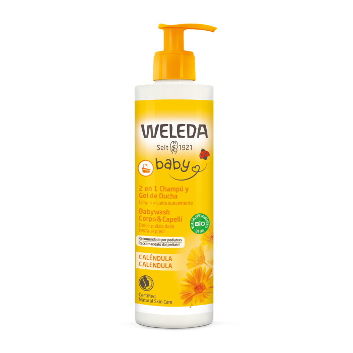 Shampoo e gel doccia 2 in 1, deterge e cura la pelle e i capelli del bambino. Con una texture cremosa e ingredienti naturali come la caléndula bio. Adatto anche per il capezzolo.