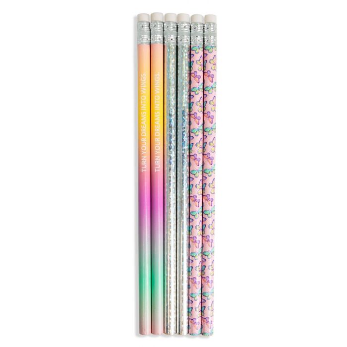 Confezione con 6 matite rotonde in legno con borchia e dettaglio metallizzato.