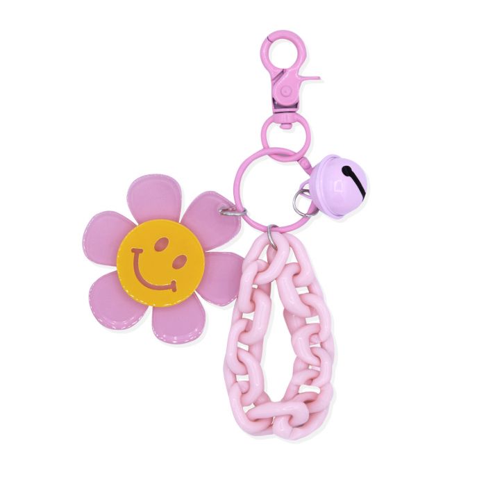 Portachiavi con catena a pvc, fiore smiley e cascabel . Usalo per aggiungere un tocco personale a chiavi, borsette, zaino... Aggancialo con la comoda clip e vedrai come diventerà uno dei tuoi accessori preferiti. Ma... non si tratta semplicemente di un portachiavi: oltre a dare un tocco divertente ai tuoi accessori, la catena leggera e il cascabel ti aiuteranno a trovare le chiavi in modo molto più rapido e semplice nella tua borsa o zaino.