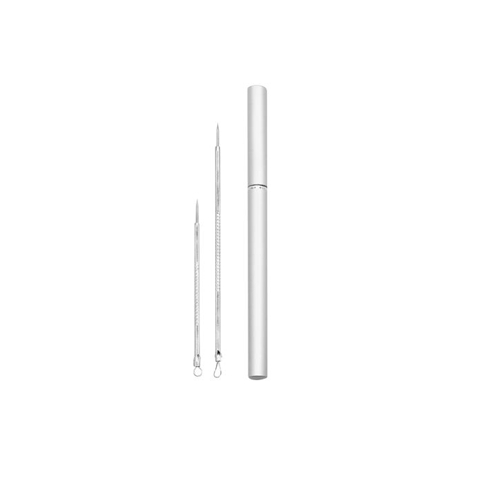 Set di due strumenti per la rimozione di punti neri e brufoli. Realizzato in acciaio inossidabile, questo set contiene due strumenti con quattro teste diverse per rimuovere le imperfezioni della pelle.