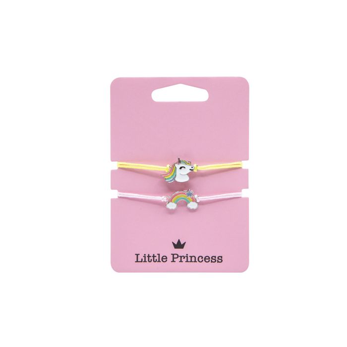 Set di 2 braccialetti con unicorno e arcobaleno nei toni del rosa e del giallo. Potete combinarli o regalarne uno alla vostra bimba, in modo da abbinarli entrambi.