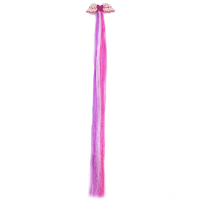 Clip decorata con ali e cuore glitter con una ciocca di pelliccia sintetica colorata con una lunghezza di 38 cm.