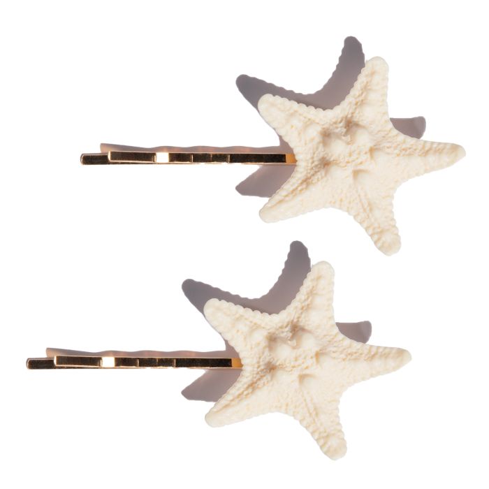 Un dettaglio marino che sembra provenire direttamente dal fondo dell'oceano. Questo set comprende due fermagli per capelli decorati con una delicata stella marina bianca, perfetta per aggiungere un tocco di fantasia da sirena a qualsiasi acconciatura.