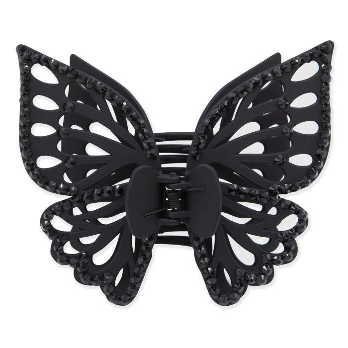 Concentrate l'attenzione del look sulla vostra acconciatura con questo fermaglio a farfalla nero con finitura soft touch e diverse ali fustellate.