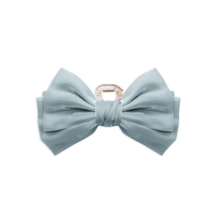 Fermaglio per capelli con fiocco metallico color pastello incorporato, ideale per trattenere anche le chiome più voluminose in acconciature raccolte e semi raccolte.