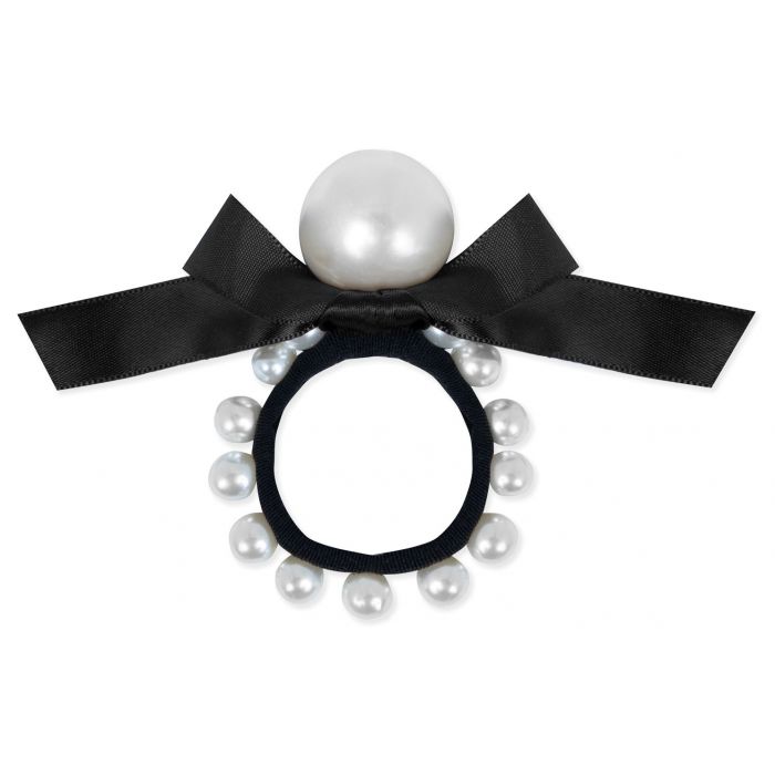 Gomma rotonda impreziosita con perle e fiocco in tessuto mas perla grande.