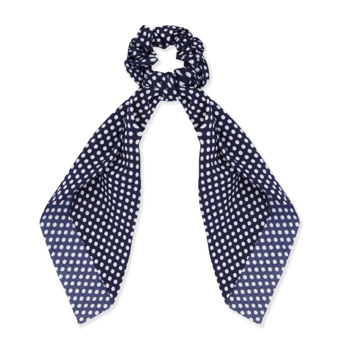 Un classico che funziona sempre per qualsiasi look è questo scrunchie con fiocco a pois blu... Per un mezzo updo o una coda di cavallo.