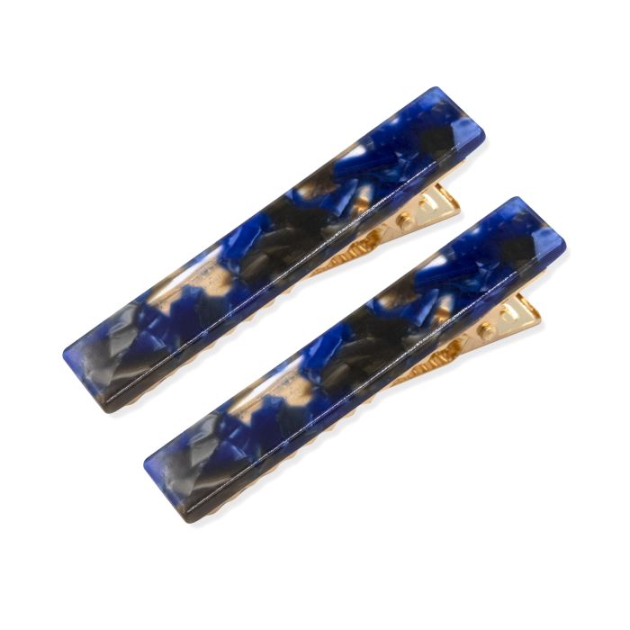 I fermagli sono la regina dello street style. Un must per ogni acconciatura. Con questo set di due clip quadrate in blu tartaruga potete abbinarle sia ai capelli sciolti che agli updos.
