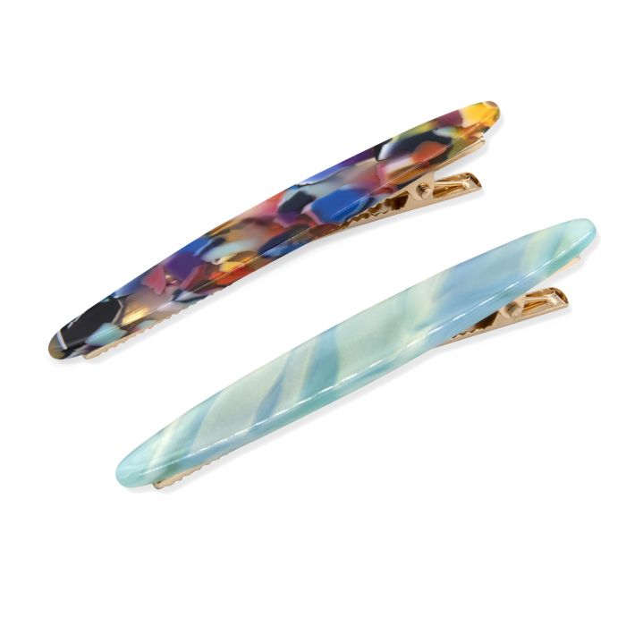 I fermagli sono le regine dello street style. Un must per ogni acconciatura. Con questo set di due fermagli tartarugati multicolore potete abbinarli sia con i capelli sciolti che con le acconciature.