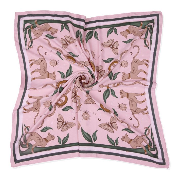 Foulard quadrato rosa con stampa fantasia. Perfetto per annodare e decorare le tue acconciature. Inoltre, grazie alle sue dimensioni, puoi usarlo come capo di abbigliamento.