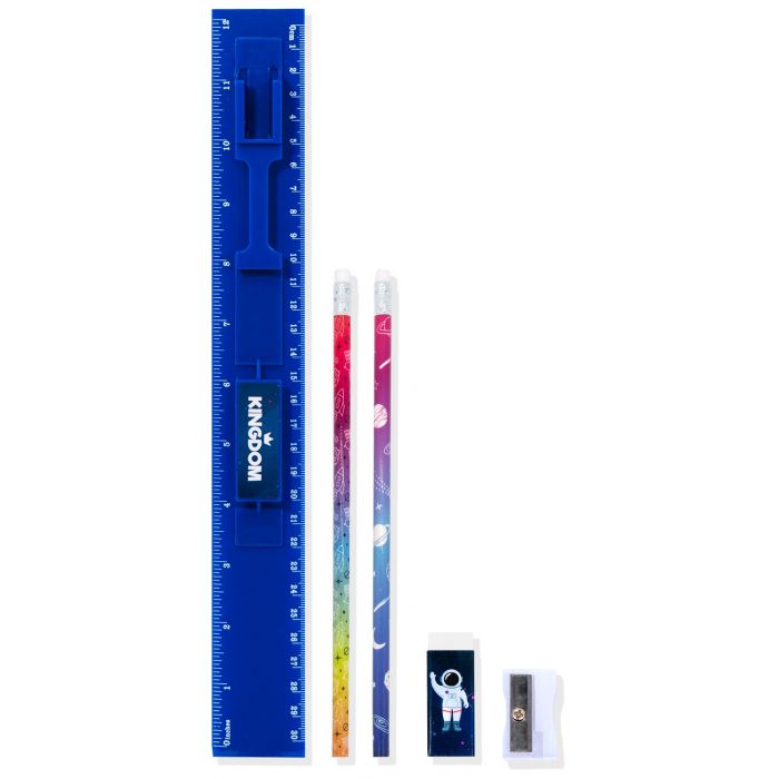 Il set comprende 2 matite, 1 gomma da cancellare, 1 punzone e 1 righello da 30 cm.