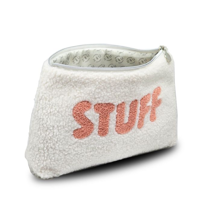 Aggiungete un tocco di stile e morbidezza alla vostra routine con questa affascinante beauty-case in pelle di pecora di ZIU. Il suo design ricamato "STUFF" la rende l'accessorio perfetto per trasportare i vostri oggetti di bellezza ovunque andiate.